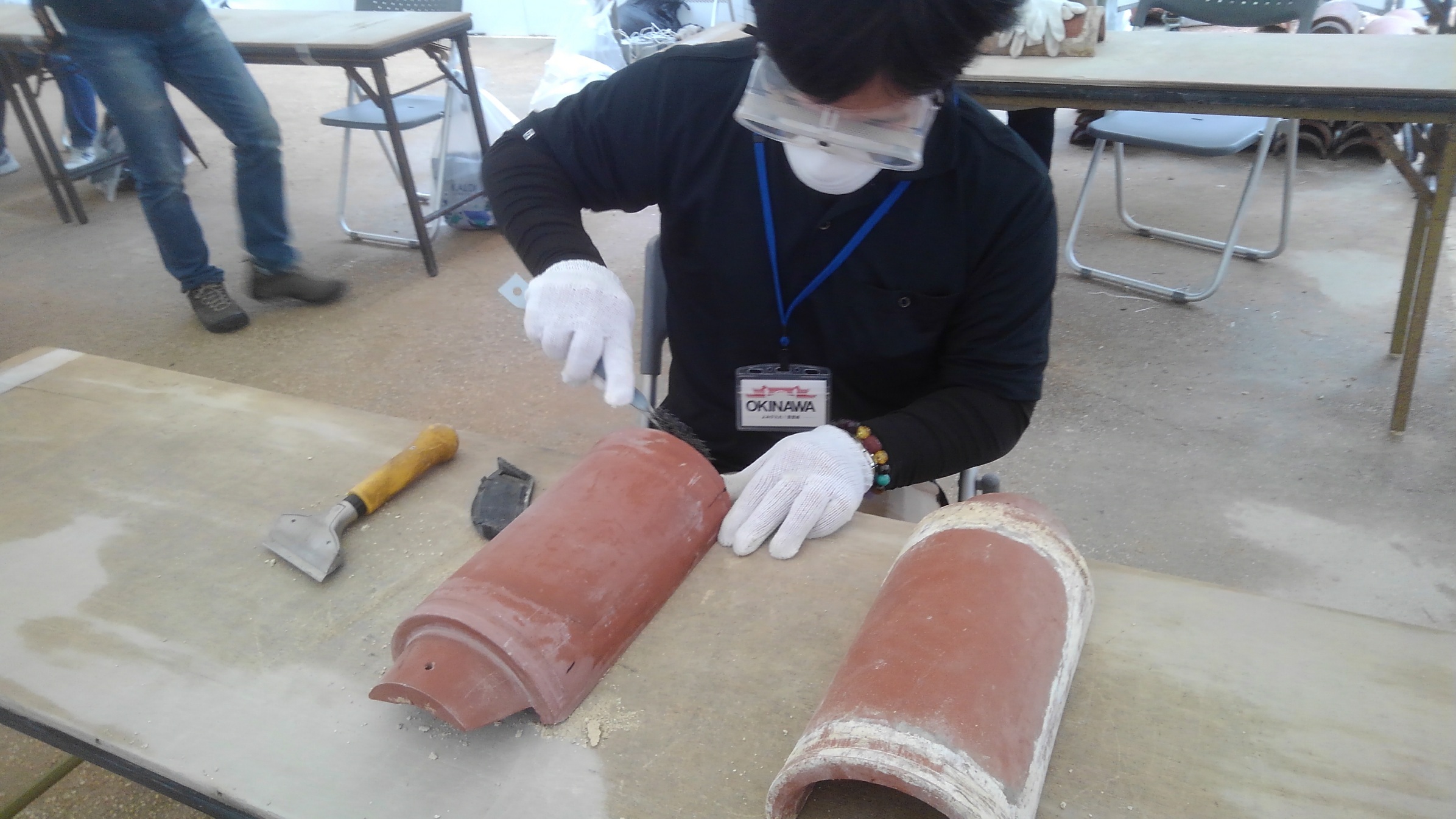当日は、「首里城赤瓦の漆喰はがし」を約2時間半ほど、その後、首里城付近のごみ拾い等を行いました。